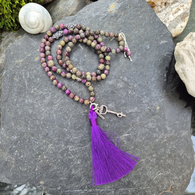Longueur env. 74 cm - Pompon violet en nylon et breloques amovibles :  clé + "love" en acier inoxydable et argent 925.